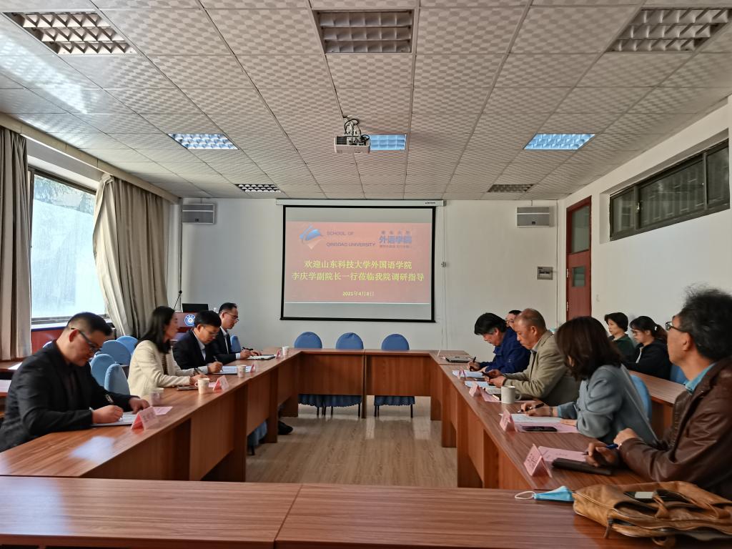 2021年4月8日下午,山东科技大学外国语91论坛副院长李庆学、英语系主任王明亮、日语系主任陈昌柏和朝鲜语系主任刘霞一行莅临91论坛