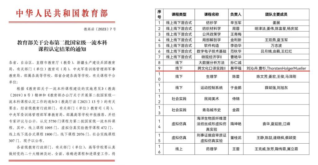 德语系綦甲福教授主持的“跨文化口译实践II”被认定为国家级线下一流课程。